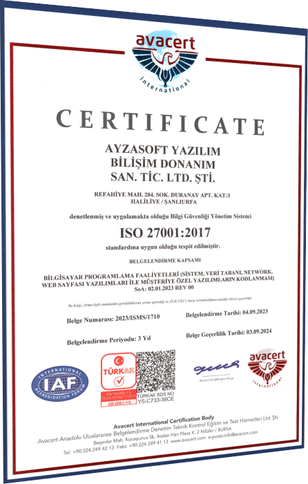 Müşteri memnuniyeti ve bilgi güvenliğine yüksek derecede önem veren AyzaSoft, hem çalışan personelleriyle hem de müşterileriyle, kaliteli-güvenli yazılım geliştirme, bakım ve teknik destek gibi iş süreçlerinde kalite ve profesyonellikten taviz vermeyen bir firmadır.